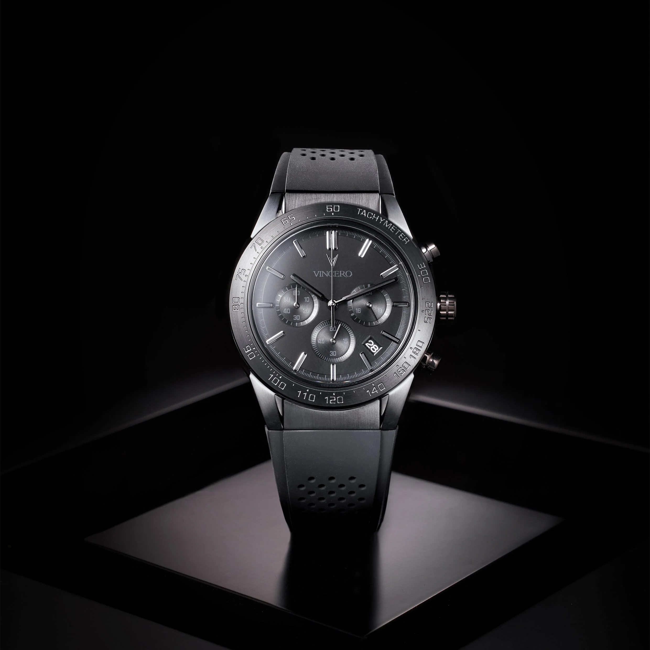 Our men's Rogue - Midnight chronograph sport watch features a 3 hand Citizen Miyota movement and a black silicone watch band. The 316L stainless steel casing features scratch resistant sapphire crystal glass and 5ATM water resistance.